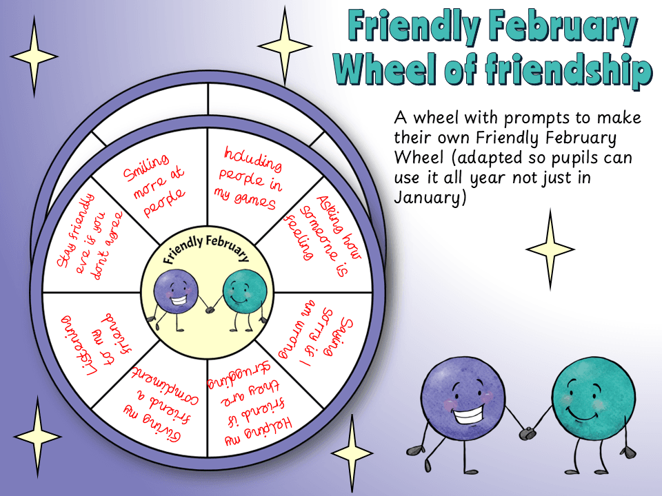 The Friendly February Wheel of Friendship is a simple, child-led activity that helps children notice and celebrate the small acts of kindness, connection, and friendliness in their lives. Using the blank wheel, children can draw or write words, short phrases, or sentences about the people, places, activities, and moments that make them feel connected, supported, or happy. There are no right or wrong answers, and children are encouraged to complete the wheel at their own pace, making it a flexible and inclusive tool.